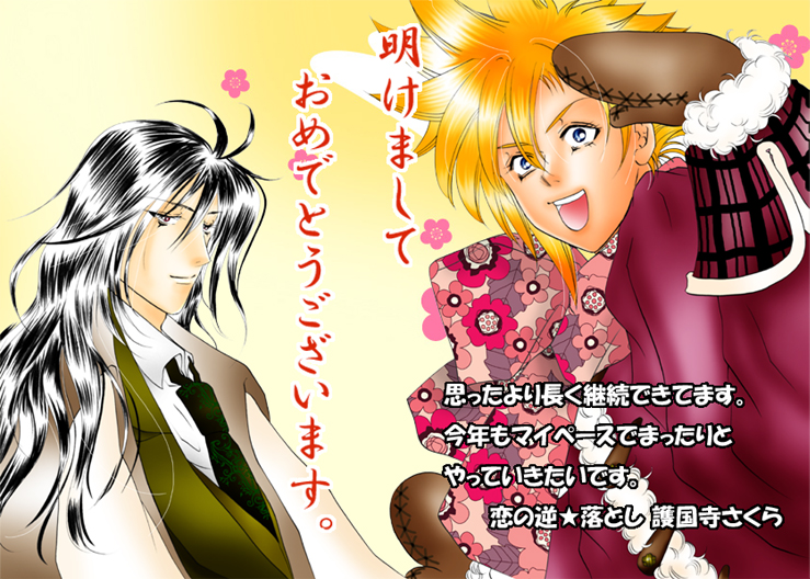 | 2010年、お正月イラスト。この年ものっけから生理痛に悩まされましたな〜(泣) ……上のコメント、2009年と変わらないです……アタシって、年がら年中、生理痛に悩まされてるんだなァとウツな気分になりました。 この年はなんとか帰省したんだけど、絵を描くのも文章を書くのもきつくて、それでも、やっぱり新年だし〜って頑張って描いたのでした。制作時間、三時間程度だったと思います。(笑) 昨年が、セフィロスとジェネシスだったから、この年は主役のふたりを描いてみました。相変わらず可愛いクラと保護者ヴィンちゃんです。 |
